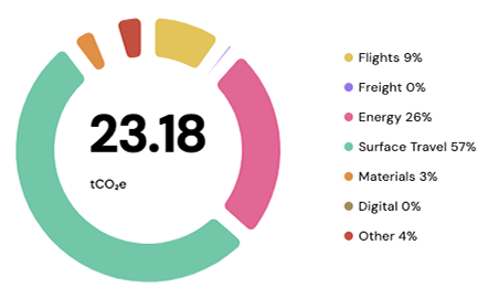 - *Surface Travel* makes up 57% of emissions at 13.31 (tCO2e)