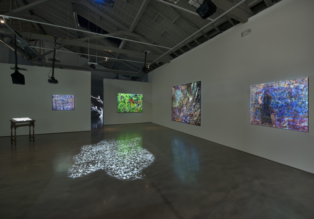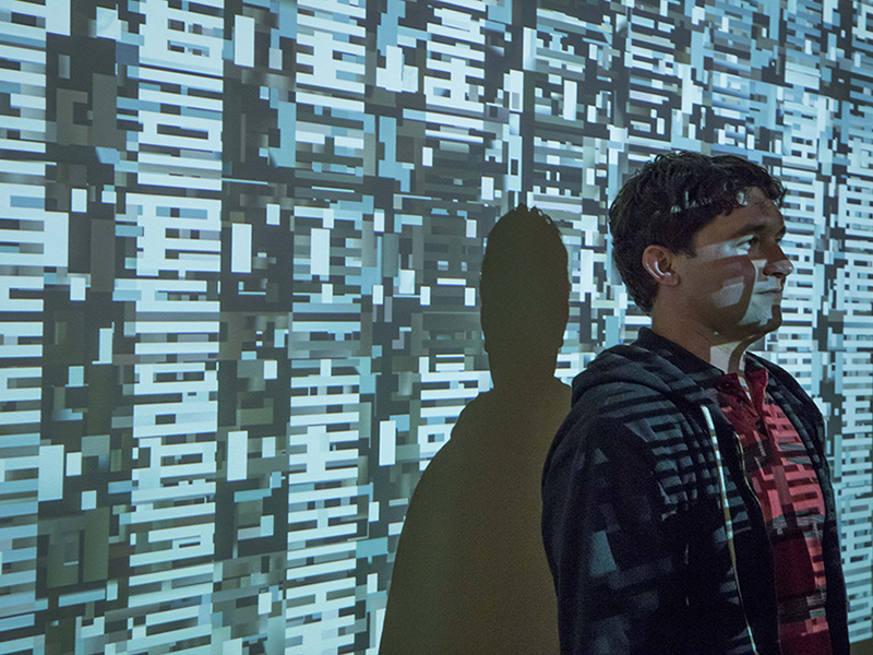 Poetic Codings explores the relationship between art and technology through the use of wall projections, interactive installations, and tablet computer apps. Artists include John Baldessari, John Carpenter, Jason Lewis, Lia, Erik Loyer, Casey Reas, and others.