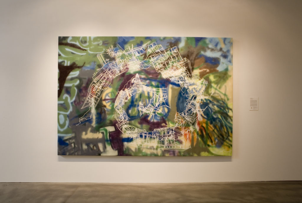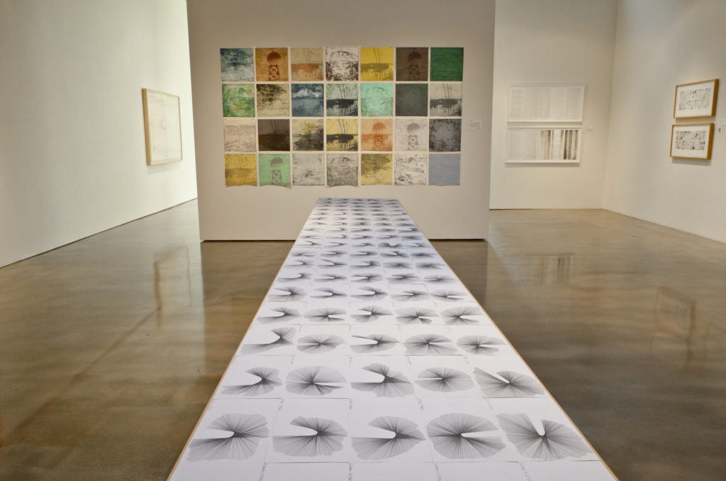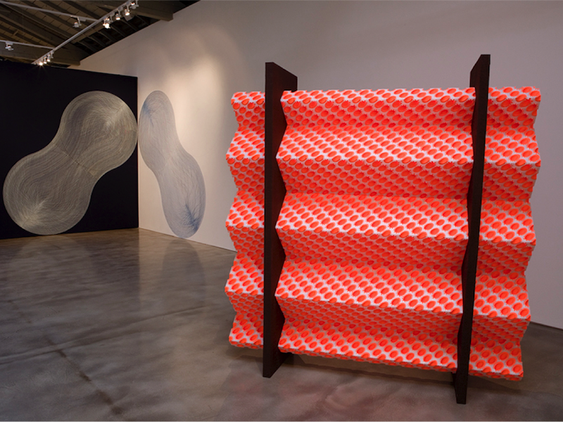 The Space Between: A six-artist exhibition stylistically focused on minimalism, geometric abstraction, and optical art. Featured at right is a large-scale optical wall drawing by Linn Meyers. Other artists include Freddy Chandra, Brent Hallard, Gay Outlaw, Mel Prest, and Nancy White.