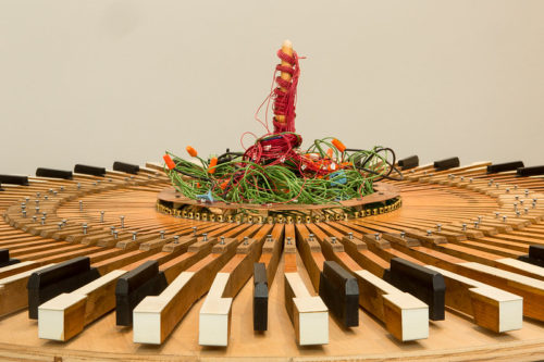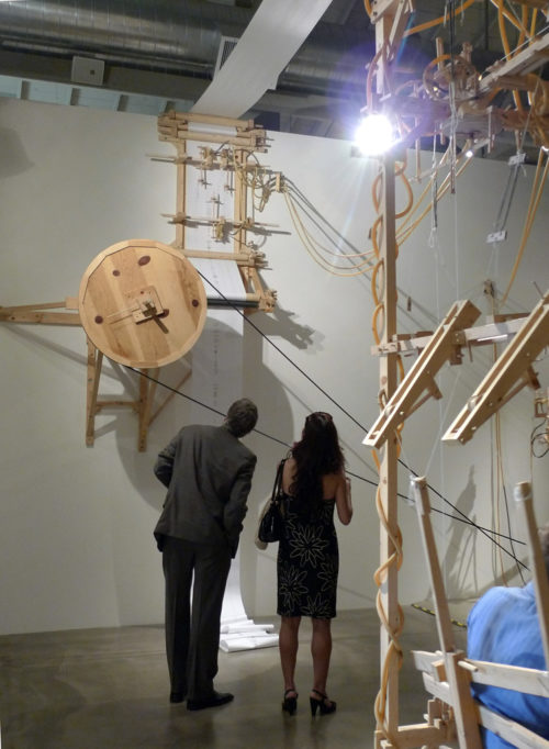Terry Berlier’s work is rooted in experimentation, risk taking, and problem solving. Many of the works incorporate kinetic features and sound elements and some require participation and collaboration from the audience. A combination of lowend tinkering and high-end technologies are utilized in the creation of the sculptures and her work is often composed of an amalgamation of parts that are found, repurposed, fabricated, crafted, and/or purchased. From the inception of ideas to the completed installation of her sculptures, Berlier is committed to providing a full sensory experience for the gallery visitor – much like the way we experience life.