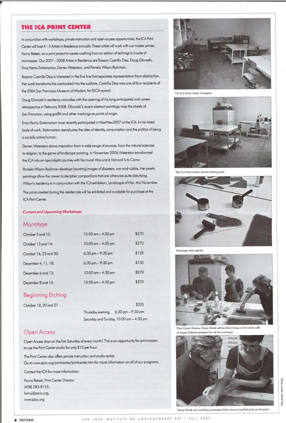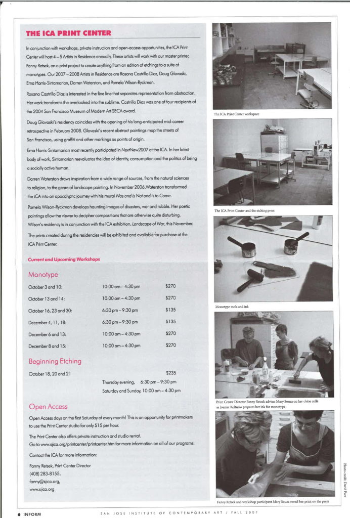 Along with its new exhibition space, the ICA opens The Print Center. It accommodates up to six printers and is the first of its kind in the South Bay. The Print Center offered an ongoing schedule of workshops led by professional printers for artists of all levels, as well as open studio days for artists.