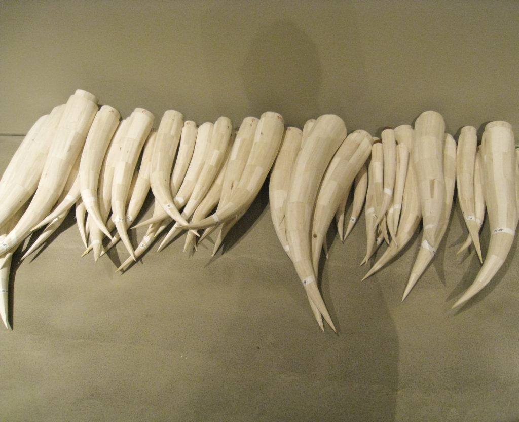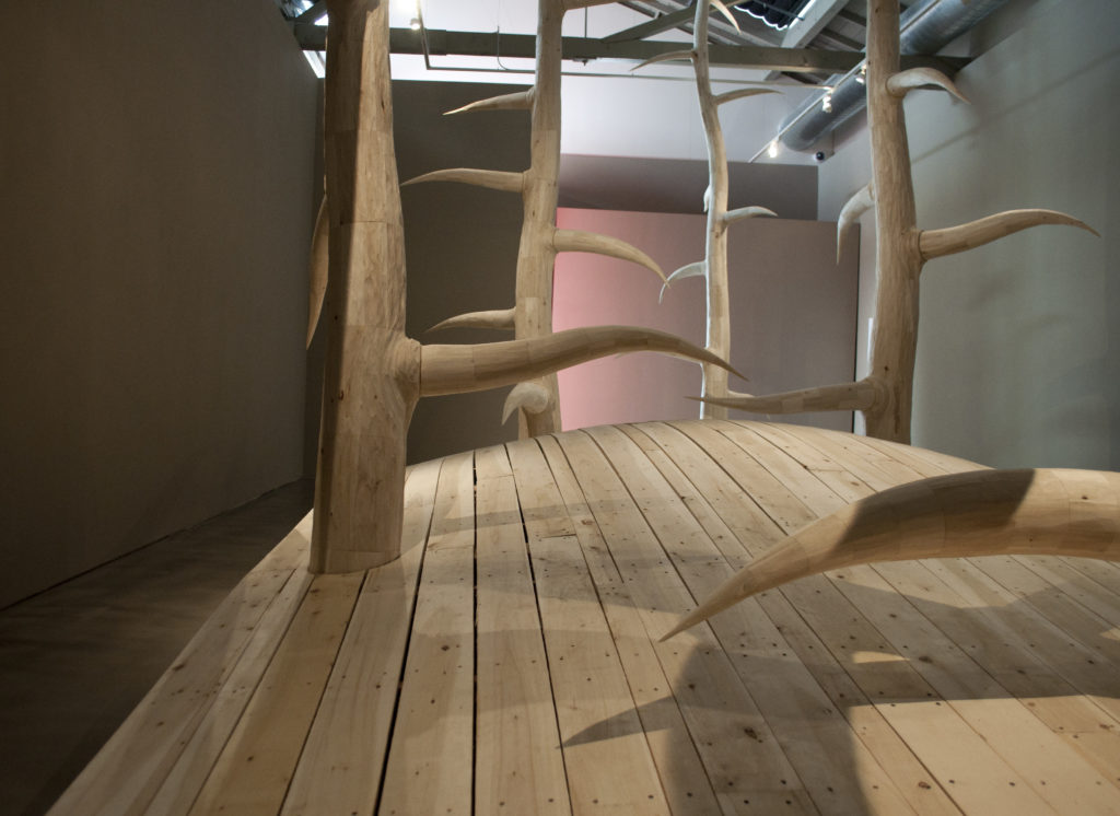 Entering Mike Rathbun’s Urgency, a monumental installation of sculptural wooden forms, is like stumbling down a rabbit hole. This bizarre world recalls the magical darkness of the Brothers Grimm and the wondrous imagination of Maurice Sendek’s Where the Wild Things Are. As visitors move into this strange environment, they are swallowed up by its monumental scale and dwarfed by a menacing forest of thorns that appear to burst out of the gallery’s ceiling.