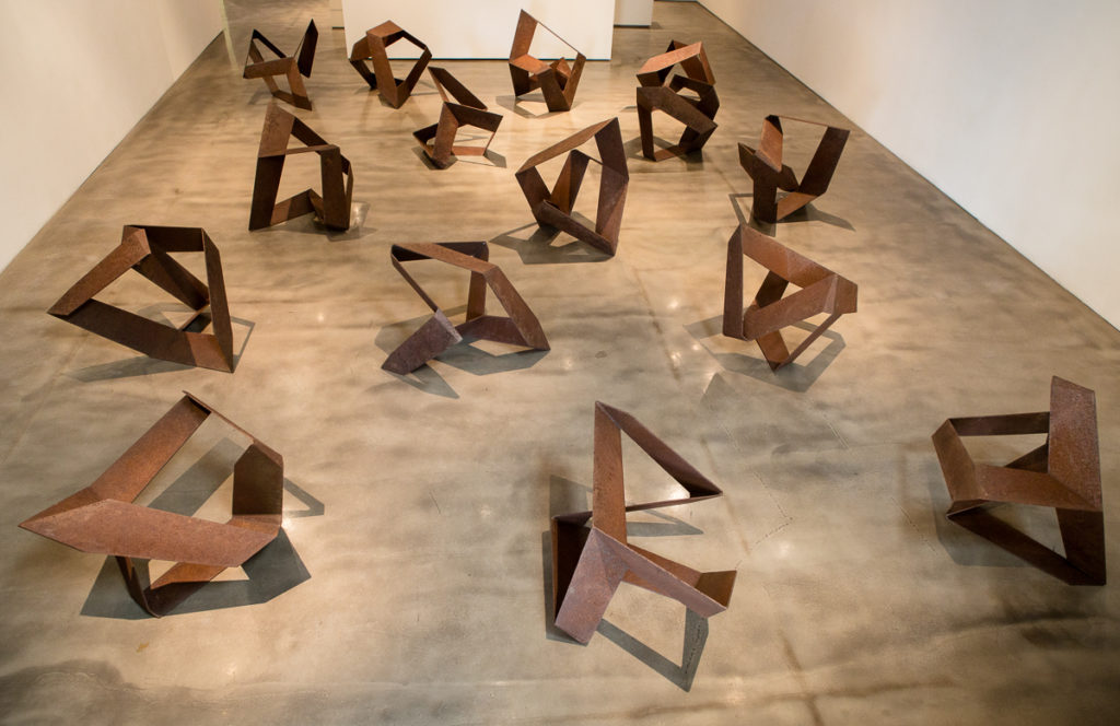 Charles Ginnever: Rashomon borrows its title from the Akira Kurasawa film of the same name, which presents widely differing accounts of four witnesses to the same crime. Reflective of the film’s plot, Ginnever’s installation consists of identical units, each of which is capable of assuming 15 distinct positions. Every angle of a Ginnever sculpture presents us with a different work of art; as one moves around the sculpture, the piece is transformed, evolving at a different pace and in a different way. According to Ginnever, “My work sits motionless and is only activated by the viewer moving around it – only then does it start to perform.”