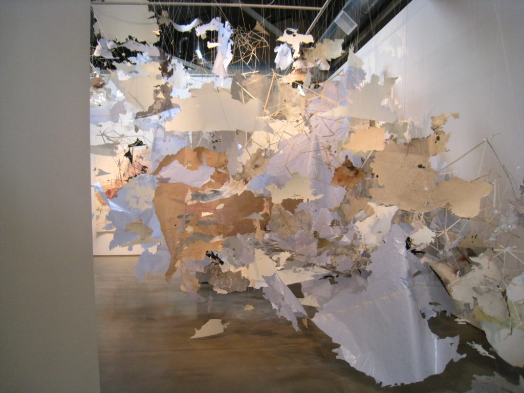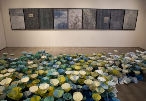 Christel Dillbohner: Ice Floe: Dillbohner’s majestic site-specific installation Ice Floe was comprised of thousands of suspended cones dipped in crisp white, blue and green pigmented wax. Motivated by her research of the melting glaciers and pack ice in the Arctic and Antarctica, Ice Floe evokes topographies of extreme climates and transformation.