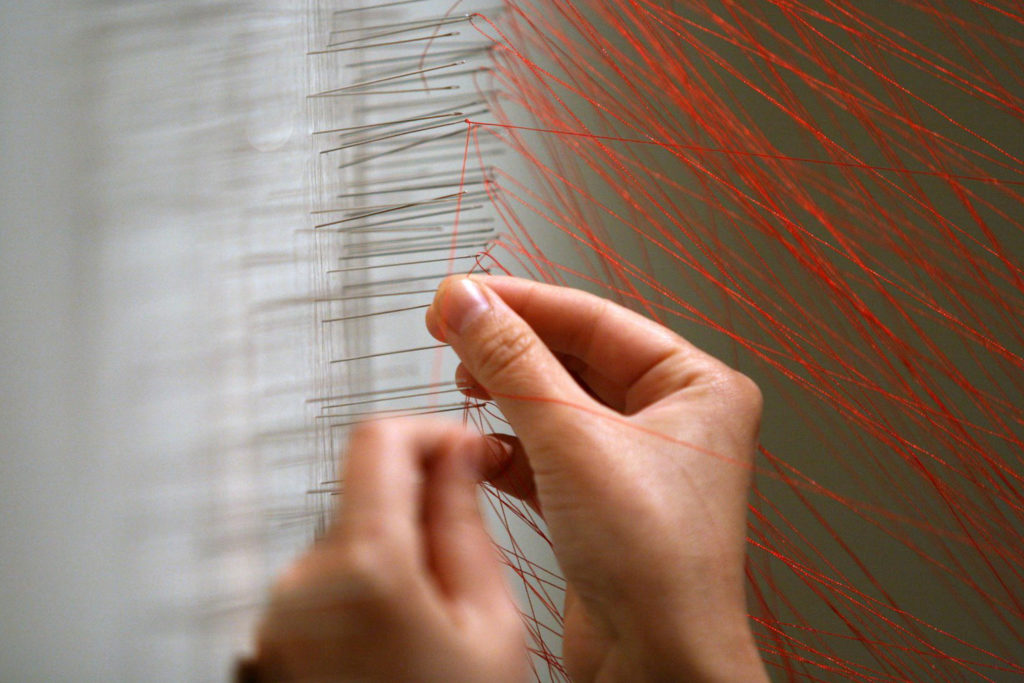 By A Thread includes 16 emerging and mid-career artists who create unexpectedly nostalgic, poetic and provocative works using thread as their primary medium. From large-scale, site-specific installations to intricately detailed minuscule illustration, traditional notions of threadwork are replaced with innovated methods and techniques that truly bend the dynamics of the medium.