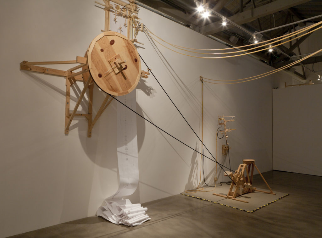 Eckert is a California-based artist who uses technology and machinery—media that are often thought of as cold and impersonal—as vehicles for exploration and introspection. This exhibition presents two large installations, Blink and Babel. In Blink, Eckert installs a row of mechanical eyeballs peering out from the wall. The individually articulated eyes follow gallery visitors, tracking their every move. Babel, which consists of several small writing machines, is programmed to write a message in different handwriting styles and languages. Together, the two works reflect the conundrum we face in our contemporary society: appreciating the joy of convenience and technology’s ability to provide us security and safety, versus negotiating between the disconcerting, constant surveillance and intrusion in our lives.