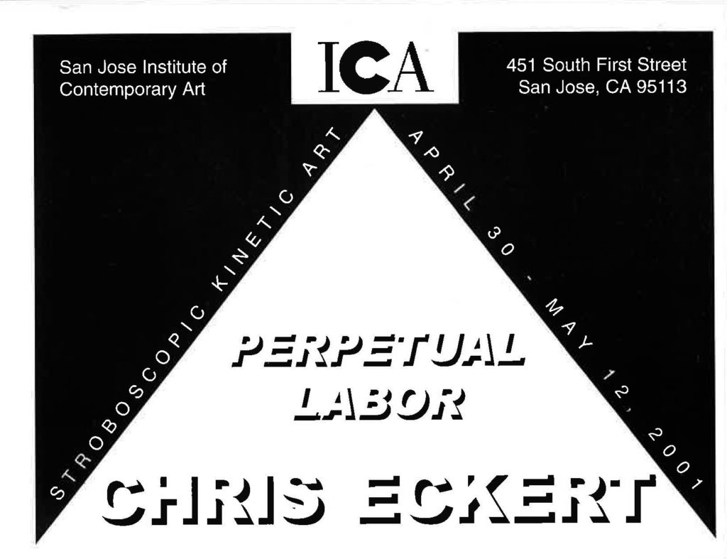 The first Night Moves event featuring Perpetual Labor by Chris Eckert, a San Jose State graduate student, premiers at the ICA. Night Moves is an after-dark program that presents installation works in the front window of the gallery’s façade. The City of San Jose’s Office of Cultural Affairs granted the ICA the funds to purchase necessary equipment.