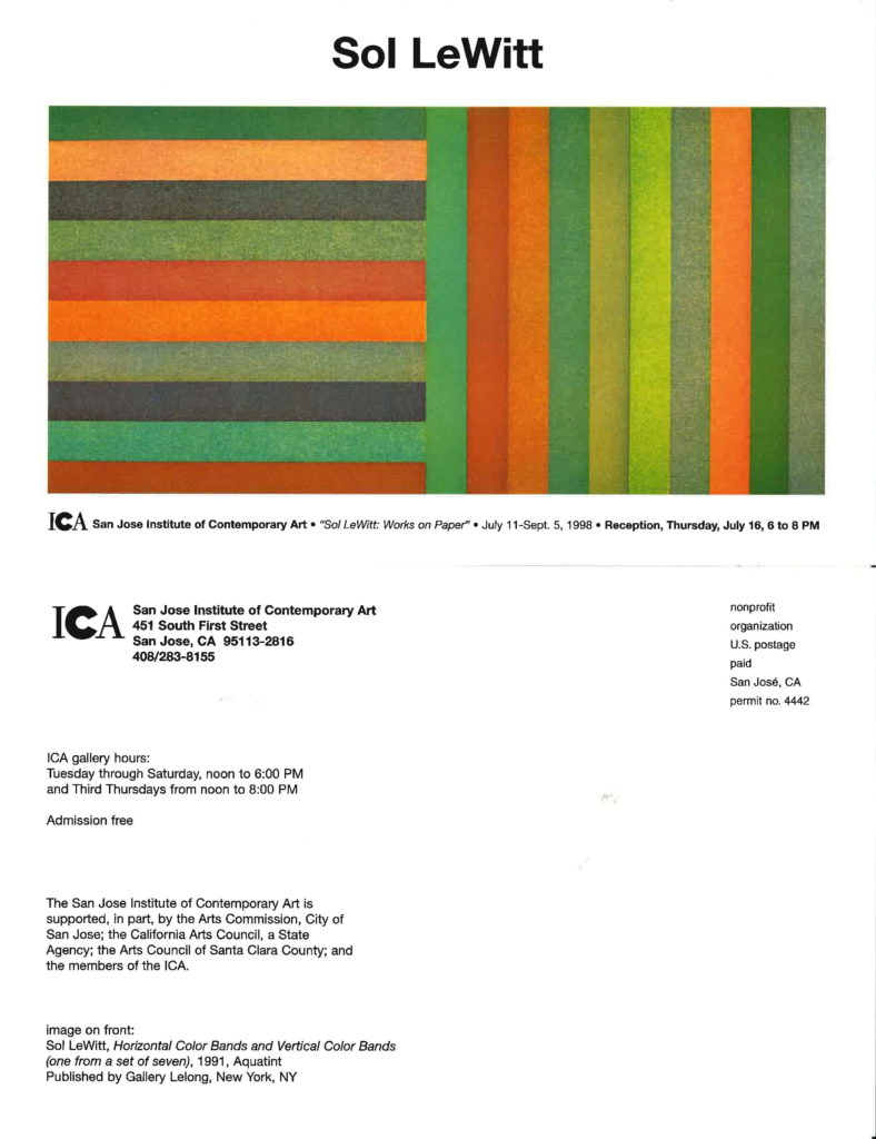 Richard Diebenkorn: Etchings: Process into Form opens on September 7, 1984. The exhibition featured recent etchings created by Diebenkorn at Crown Point Press in Oakland. Robert Tomlinson, Director of the San Jose ICA, would write in the exhibition catalogue that this show “offers the members of our community an opportunity to view the entire creative process, from casual sketch to finished print, of one of America’s finest artists.” The exhibition travels to the Milwaukee Art Museum in June 1985.