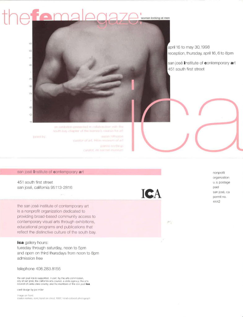 The Female Gaze: Women Looking at Men was produced in collaboration with the South Bay chapter of the Women’s Caucus for Art. Challenging the long tradition of the male gaze in Western art, this juried exhibition invited women artists of the Bay Area to enter their own takes on the male figure. All depictions of men (the good, the bad, the ugly) were welcomed.