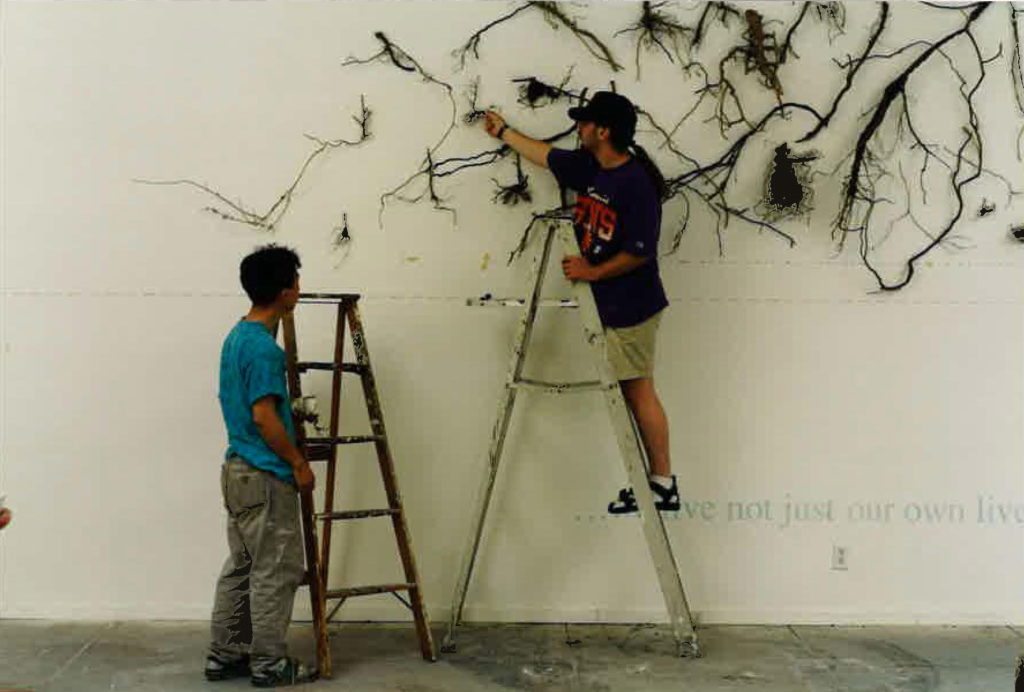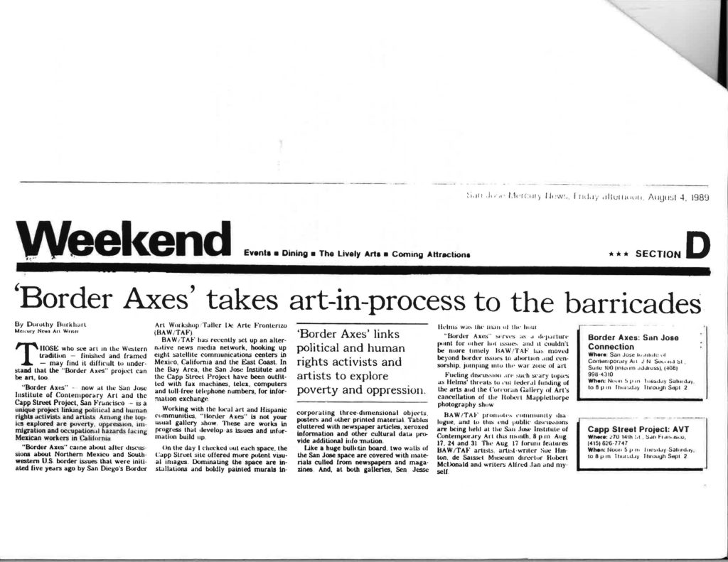 Border Axes: San Jose Connection connects artists with political and human rights activists to produce a series of works that explore poverty, oppression, immigration, and the occupational hazards of Mexican workers in California. This project grew from discussions about border issues that were initiated by the San Diego’s Border Art Workshop Taller De Arte Fronterizo. The exhibition also marks the ICA’s temporary expansion to a second building at 2 North Second Street in San Jose, the former site of the Johnson Wax Development Corporation.