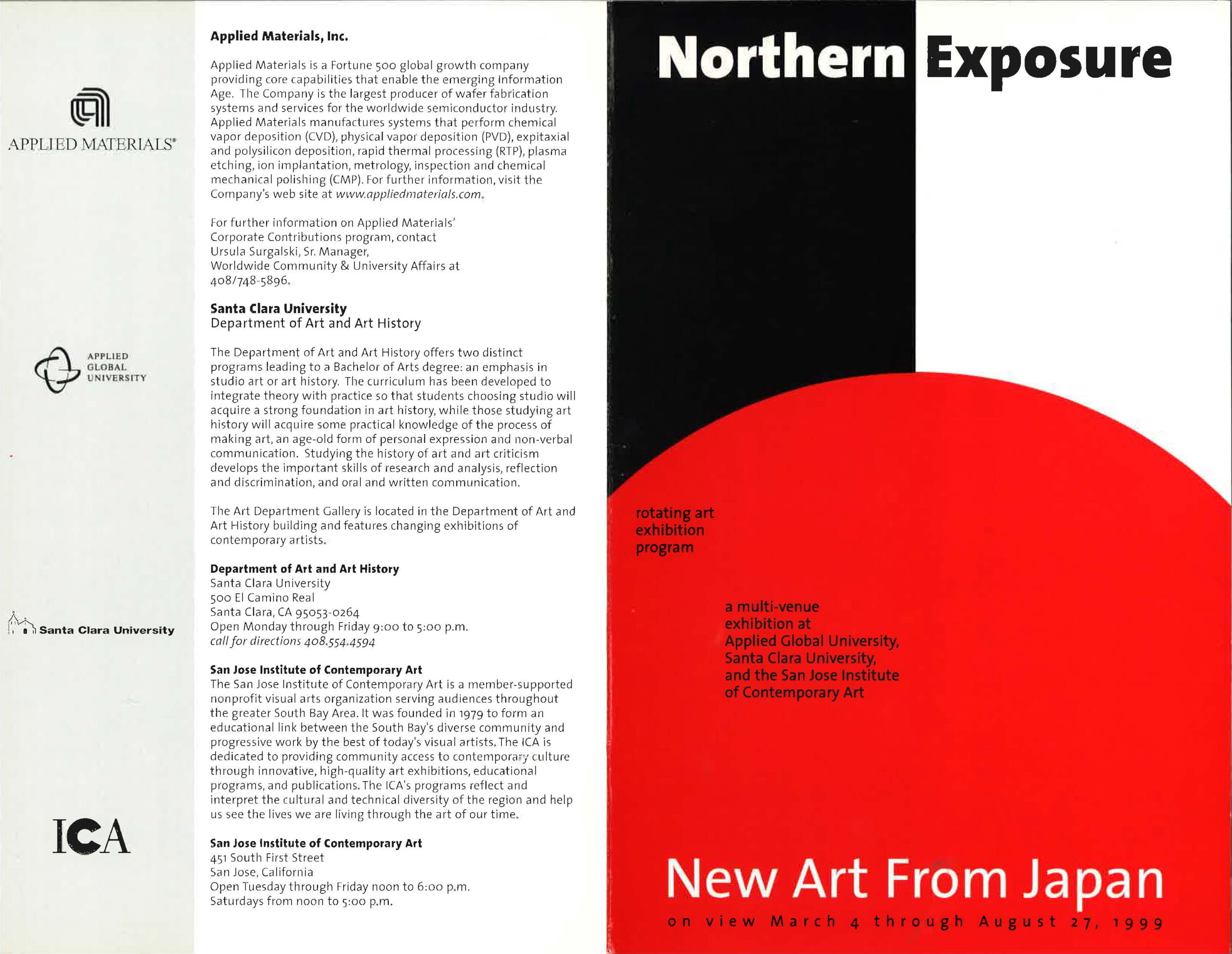 Northern Exposure: New Art from Japan features the work of 14 contemporary artists from the Narita to Hokkaido regions of Japan. To present this multi-venue exhibition, the ICA formed a unique partnership with Santa Clara University and Applied Materials, bringing together cultural, educational, and corporate institutions to exhibit works by acclaimed international artists.
