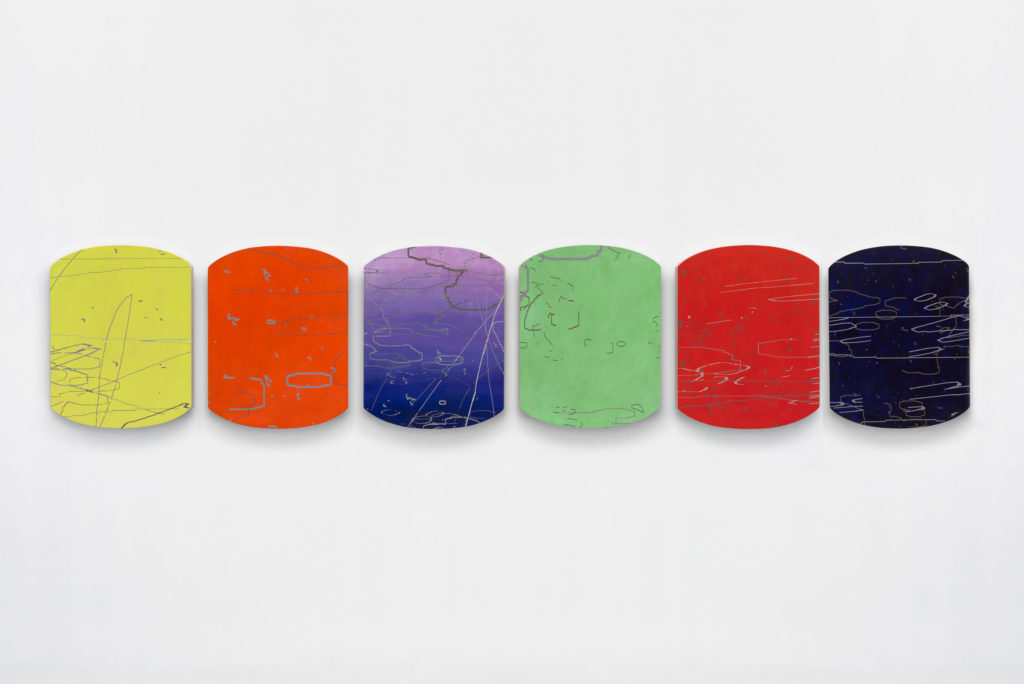 Amy Ellingson’s work explores the dichotomy between digitally rendered imagery and traditional painting. She systematically and sometimes playfully uses repetition to create a body of related works. By imposing constraints on her process, she is able to explore the endless variables within her framework, so that one work will inform the next one and so forth. Ellingson’s work was created specifically for this exhibition and the ICA’s gallery space, including the artist’s first-ever mural installation.