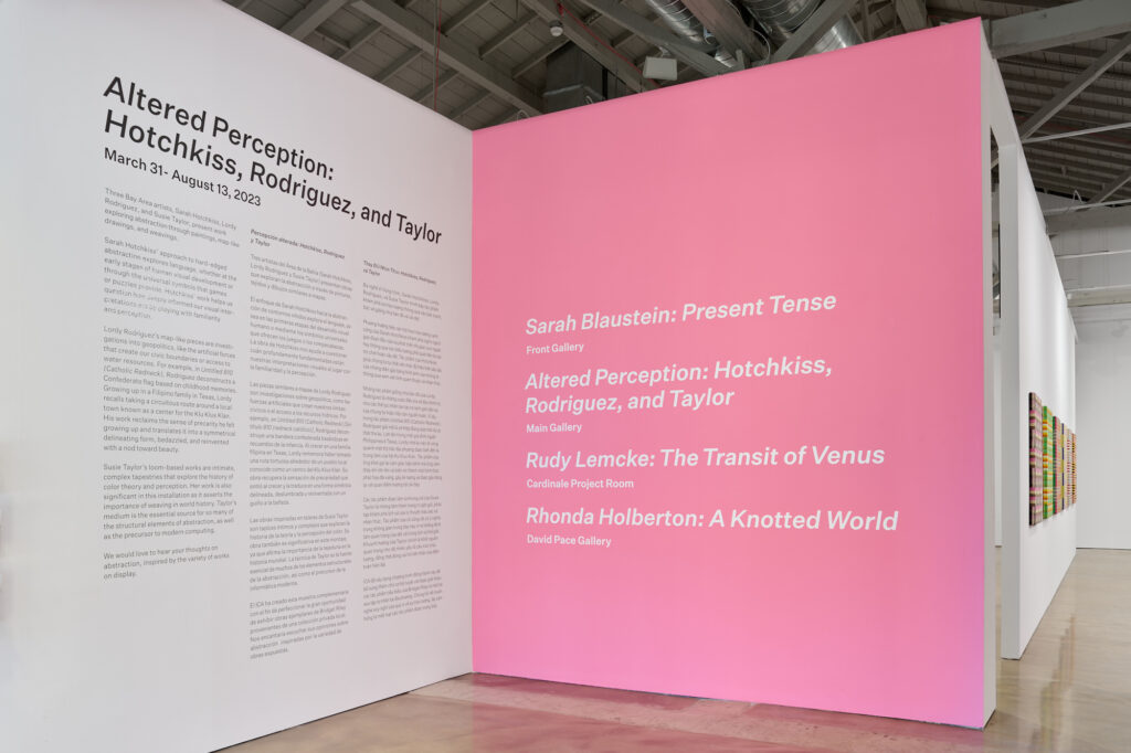 Inspired by the British artist Bridget Riley (b. 1931), who has long been known for her dizzying, vibratory paintings that set the Op Art movement in motion, the exhibition Altered Perception is a tribute to Riley and her life’s work. Altered Perception includes works from three local Bay Area artists: Sarah Hotchkiss, Lordy Rodriguez, and Susie Taylor.