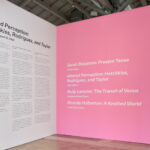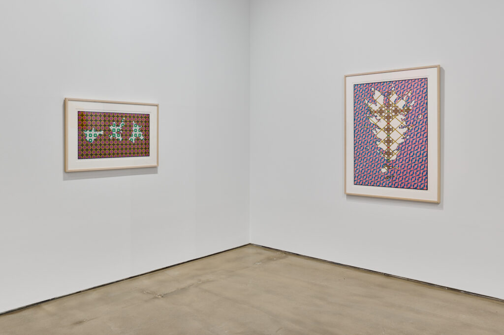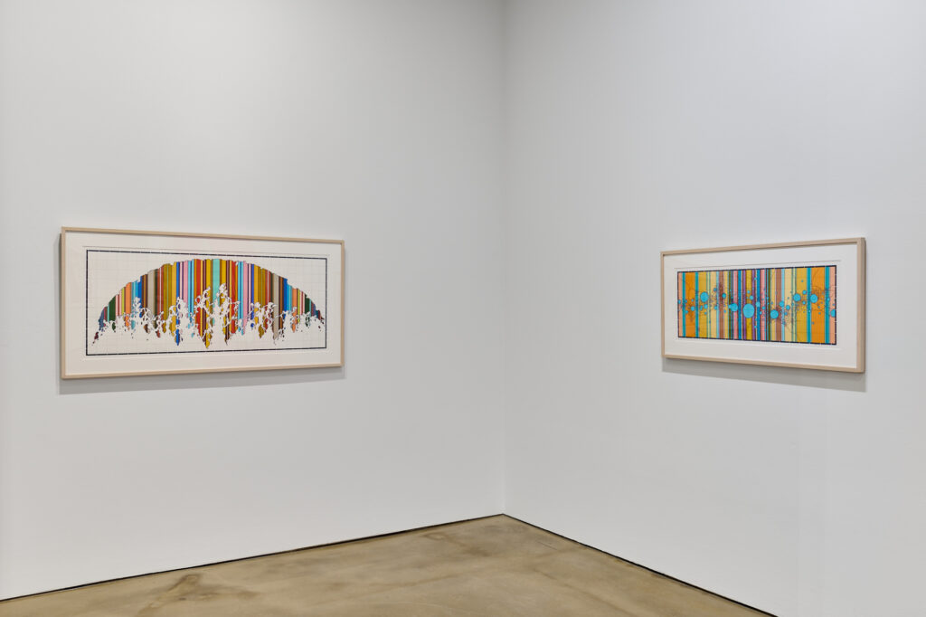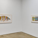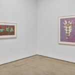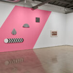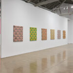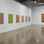 Lordy Rodriguez’s work is a more hidden albeit direct link to Riley in that the underlying backgrounds that Rodriguez creates to support his political works on gerrymandering, water resources, and geo-politics, are all informed by the visual clues and tricks that Riley developed in her full-color, often pastel-hued, large-scale paintings. For example, in the work Untitled 810 (Catholic Redneck), Rodriguez deconstructs a confederate flag into composition reflecting his upbringing in Texas in which areas where the Klan has known to settle. For Rodriguez and his Filipino family, this increased a feeling of precarity and meant they would have to always take a circuitous route when driving to be sure to go around that town.