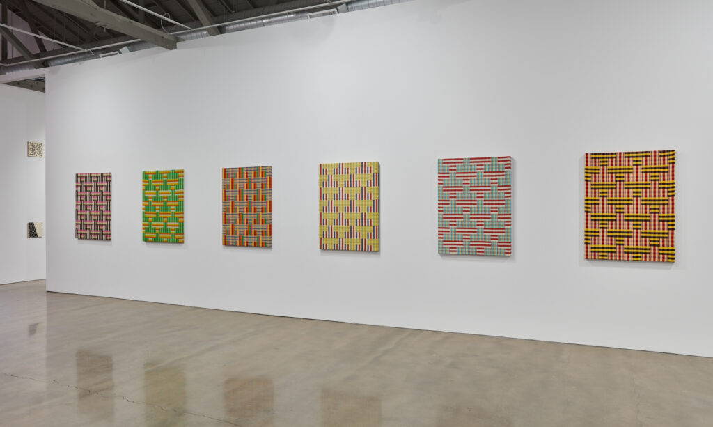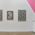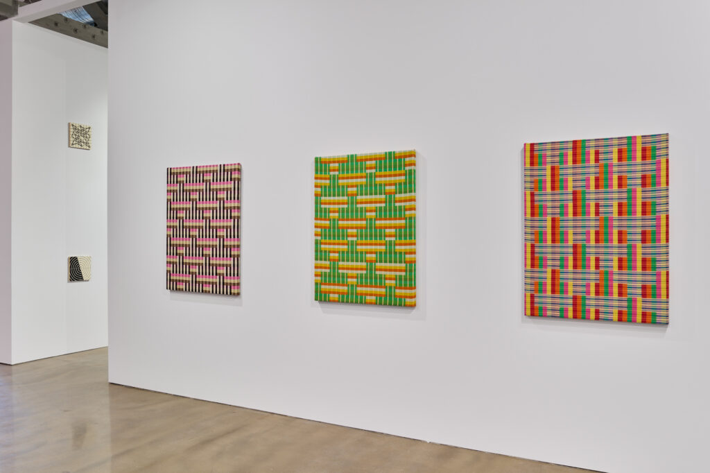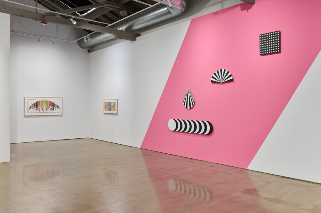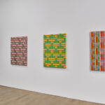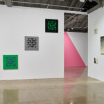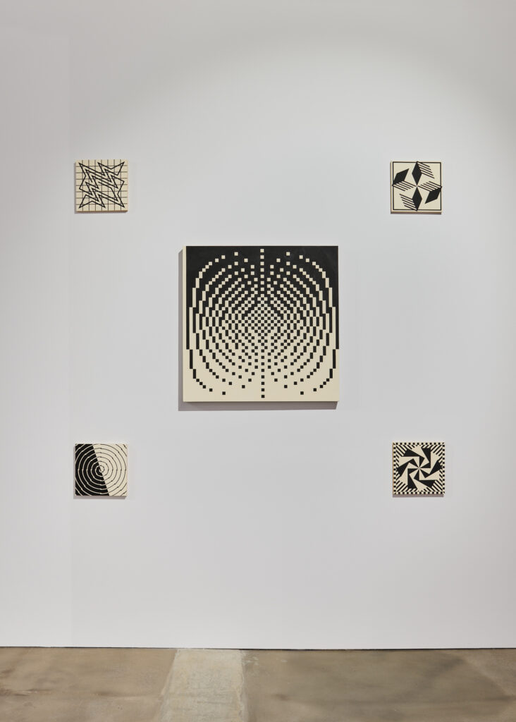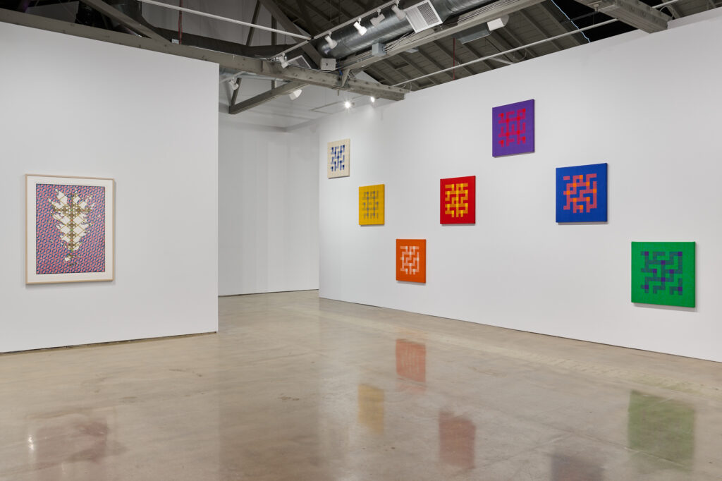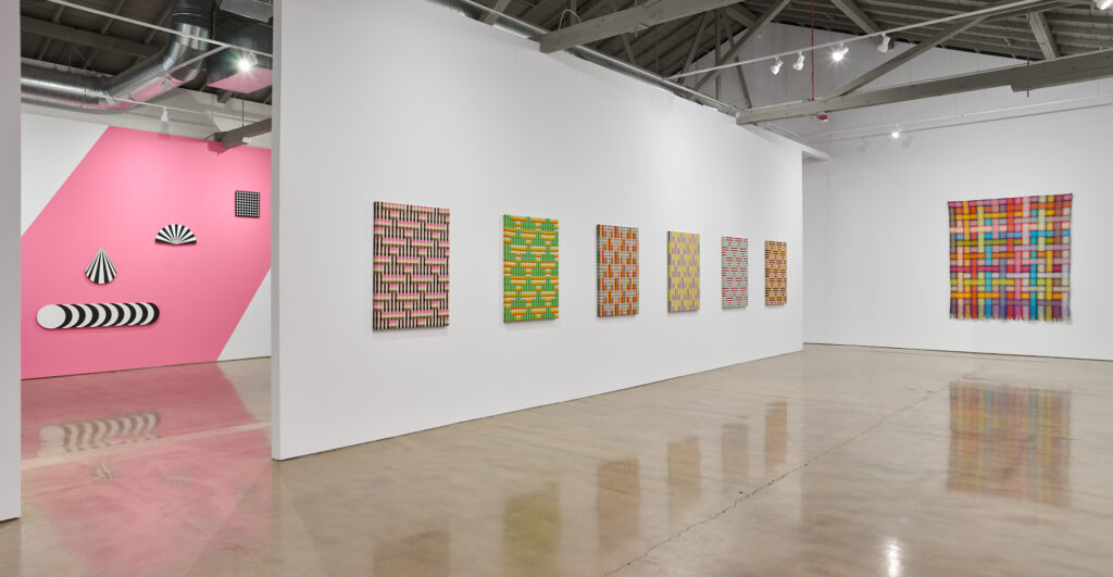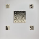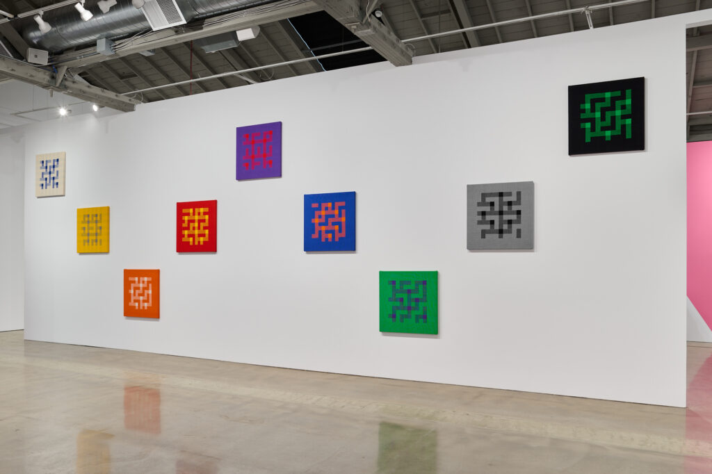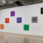 Sarah Hotchkiss’ work explores what might be called the hard-edged abstraction elements of Riley’s work. All the while also exploring how abstraction is a powerful communicating language, whether at the level of early human visual development, like pictures for babies or the universal symbols that games like parcheesi or puzzles provide. In a sense, Hotchkiss helps us to see how Riley’s innovations and legacy has so deeply informed our visual languages.