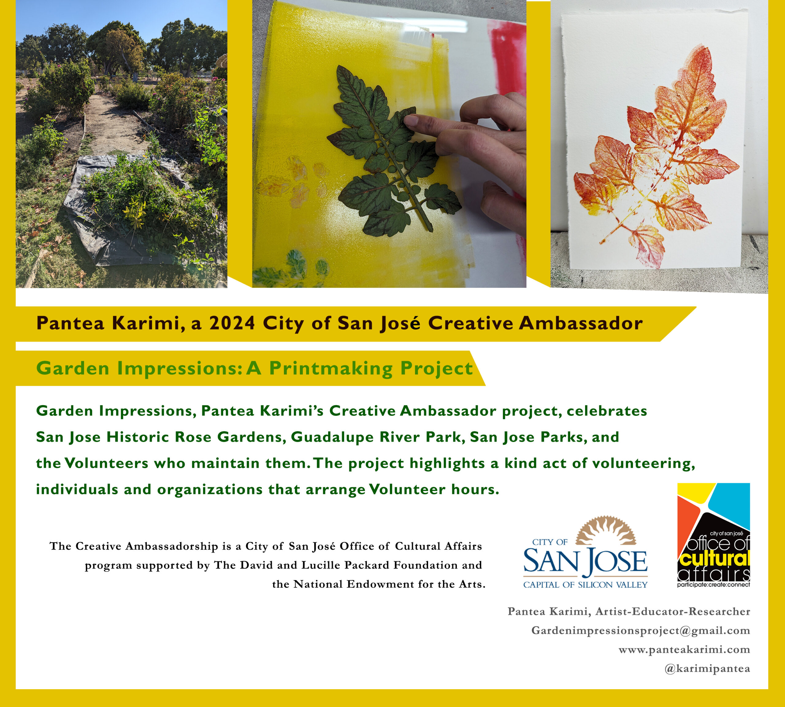 Join us on Friday, October 4th from 6-8 pm for Garden Impressions: A Printmaking Project with Pantea Karimi, A 2024 San Jose Creative Ambassador. Using collected botanical clippings, participants will make colorful small-size monoprints on paper, reflecting on the importance of keeping San José parks, and historic gardens alive and cared for. Monoprinting is an accessible, expressive, safe, water-based medium, and is open to interpretation.