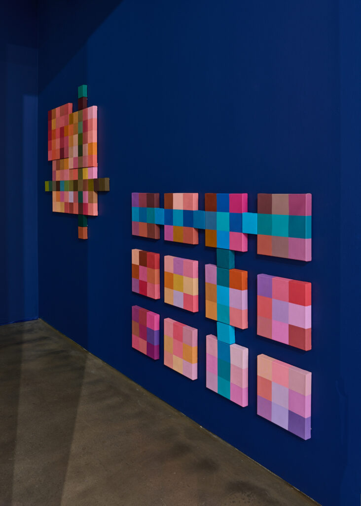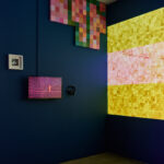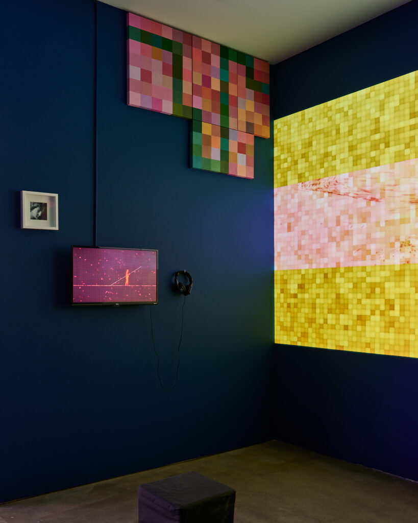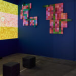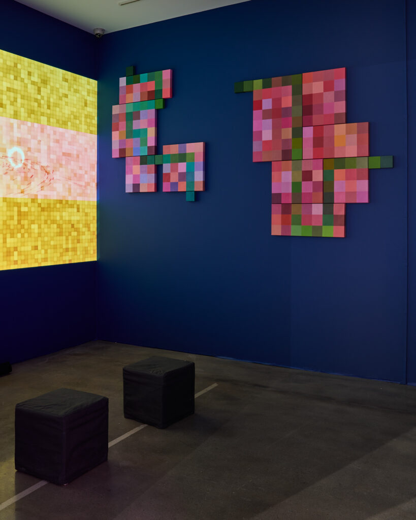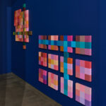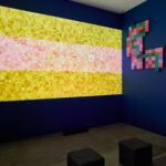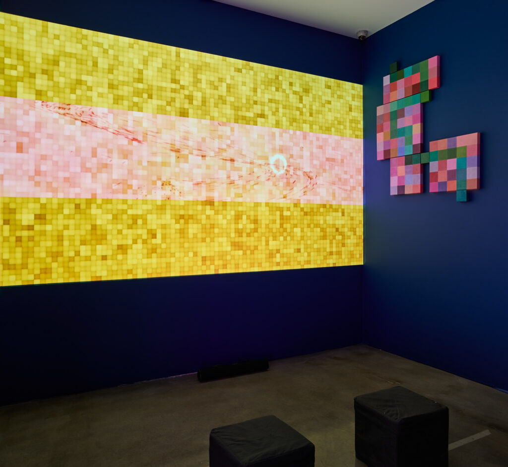 The exhibition highlights a video projection based on the Transit of Venus, which happens when Venus passes in front of the bright face of the sun. These transits are among the rarest of observable astronomical events, repeating every 243 years. In the video projection, the yellow sun-like glowing frame is crossed by a red horizontal band of abstract digitally generated animations. A second video loops on a wall monitor that shows the artist walking a tightrope across the frame. Five grid-like paintings span three of the gallery’s walls and are hung in a descending arc resembling the graphics from early 8-bit video games.