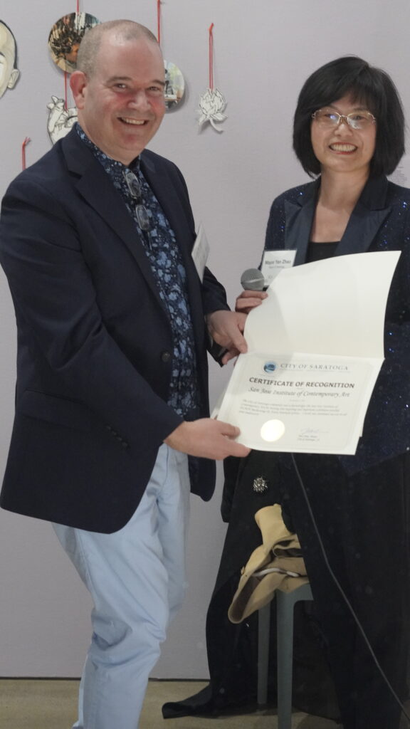 On March 23rd, ICA San José and Montalvo Arts Center debuted our joint exhibition P L A C E : Reckonings by Asian American Artists. The night was filled with music, hors d’oeuvres, and community. Over 573 people attended our public reception Saturday evening, including Yan Zhao, the Mayor of Saratoga. Mayor Zhao honored the ICA, Montalvo, and co-curators Judy Koong Dennis and Zoë Latzer for their contributions to the current exhibition.