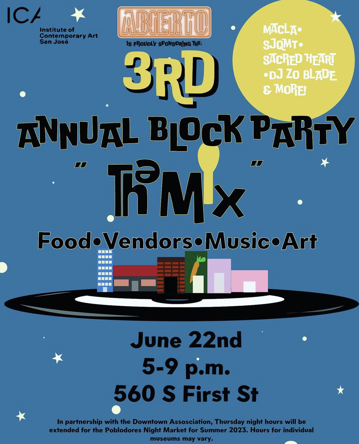 Join us Thursday, June 22nd, 5:30-9pm. The Institute of Contemporary Art (ICA) San José is throwing an outdoor S 1st Block Party in collaboration with The San Jose Museum of Quilts and Textiles (SJMQT), Movimiento de Arte y Cultura Latino Americana (MACLA), and Sacred Heart Community Service.