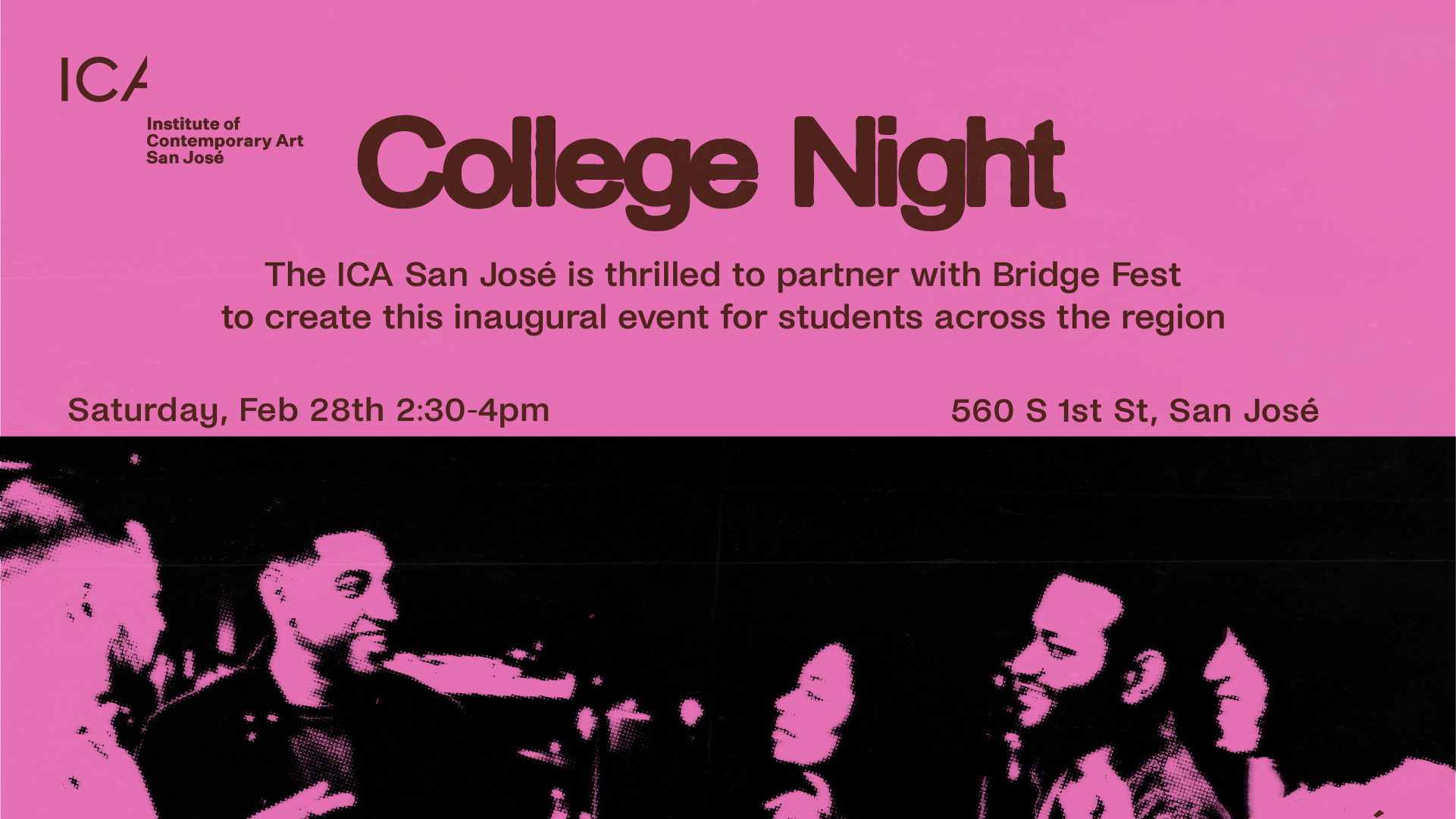 The ICA San José is excited to partner with Eric Parker and Bridge Fest for a College Night mixer at the ICA on Saturday, February 28 from 2:30-4 PM. Stop by to mingle with college students and local professionals while surrounded by the exhibitions on display at the ICA.